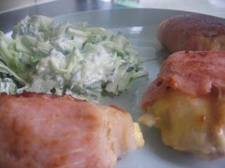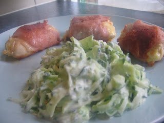 Amig a hus sul, elkeszitem a salatat.Az uborkat nagylyuku sajtreszelon lereszelem ( hejaval egyutt, hogy szep szine legyen), sozom, es belereszelek 2 gerezd fokhagymat is. Rateszem a creme fraichet vagy tejfolt, osszekeverem. Kesz is.
