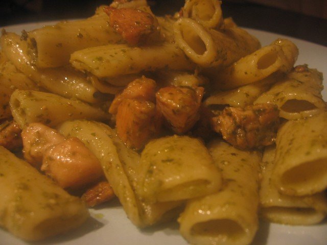 Kifoztem a tesztat, a csirkemellet kockakra vagtam es megpiritottam. Nagyon finom lett a husi,mert abban az olajban sutottem, amiben a delutani baconos hust:) Mikor kifott a teszta, csak radobtam a csirkemellkockakat es a pesztot, jol osszekevertem es mar lehetett is fogyasztani!