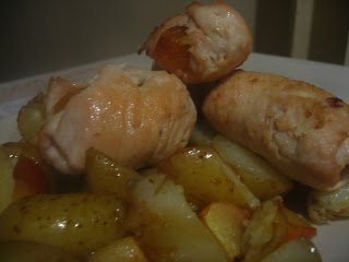 3. Egy serpenyőben hevítsünk olajat és nagy lágon pár percig süssük a tekercseket: amíg el nem kezdenek pirulni.Ezután tegyük őket a tepsibe a puhuló alma-és krumpliköret mellé, és addig süssük őket együtt, míg mindannyian puhák nem lesznek. ( Kb. félóra)