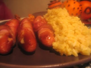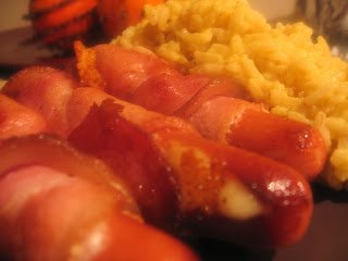 2.A virsliket hosszában vágjuk be és vékony szelet sajtokat tegyünk a nyílásba. Minden sajtos virslit 1 szelet baconbe tekerjünk be.