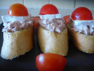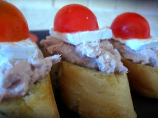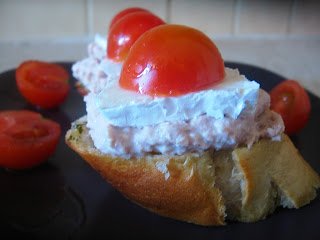 3.A kisült bagettet szeleteljük fel, minden szeletre halmozzunk egy kiskanálnyi tonhalkrémet, erre jöhet egy szeletke Brie sajt, végül pedig egy félbevágott koktélparadicsom-kalapka:)