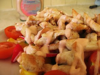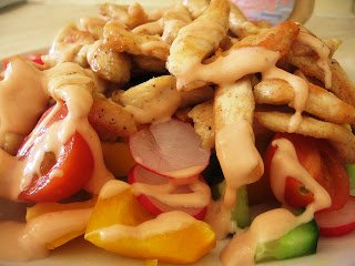 4.Egy tányérra halmozzunk a zöldségekből,tegyük rá a csirkemellcsíkokat és locsoljuk meg bármilyen salátaöntettel. ( Nekem most egy Ezersziget volt épp itthon, azt használtam.)