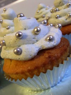A krémet töltsük zacskóba/ habzsákba és kívülről befelé haladva csigavonalban díszítsük a sütiket. Végül az ezüst cukorgyöngyökkel díszítsük és Voilá:)