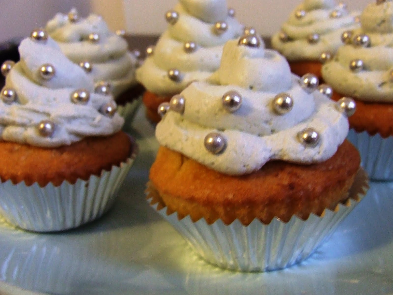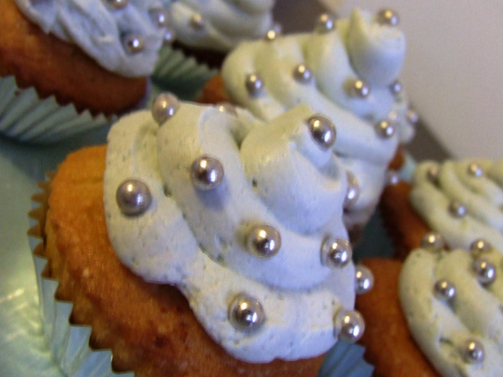 A krémet töltsük zacskóba/ habzsákba és kívülről befelé haladva csigavonalban díszítsük a sütiket. Végül az ezüst cukorgyöngyökkel díszítsük és Voilá:)