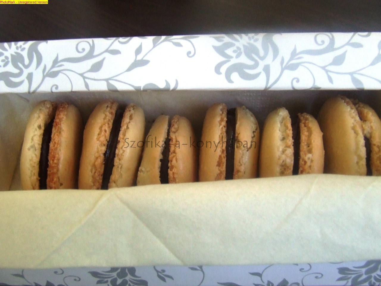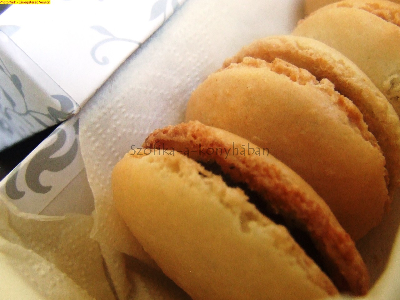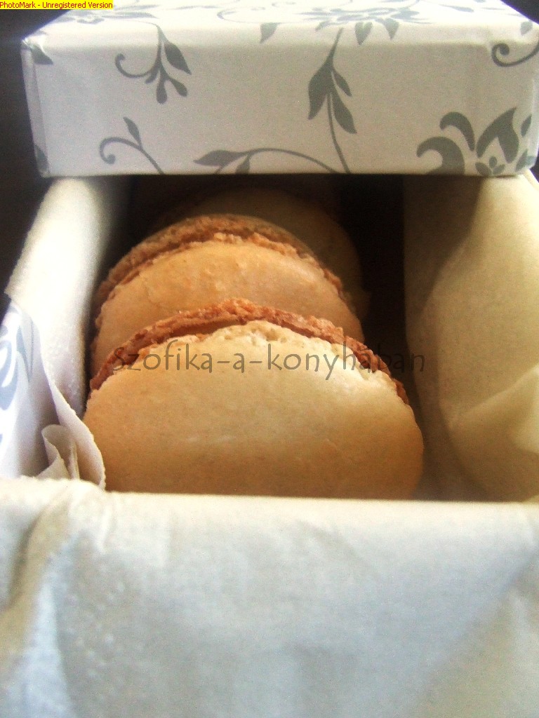 Eljött a nagy pillanat. Úgy tűnik, kezdi magát kiforrni ez a macaroon-dolog. Végre olyan példányok születtek, amik vállalhatók. Mi több, ajándékba készültek a főnökasszonyom szülinapjára. El volt ragadtatva,mikor kinyitotta a kis dobozt:)Meg akart kínálni mindenkit, de szerintem nem sikerült neki,mert négy eltűnt mire vége lett a shiftnek, szépen megeszegette őket. 🙂 Nekem meg dagadt a májam a büszkeségtől.