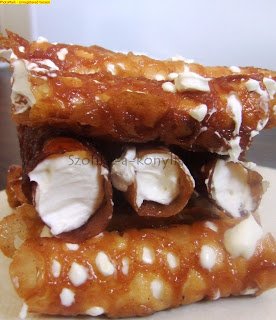 5. Egy fakanál nyelét bevizezzük és óvatosan rácsavarjuk a masszát. Tegyük rácsra, várjunk pár percig míg hűl,majd óvatosan húzzuk ki a fakanalat a cuccból.:)) Akkor jó, ha lyukacsos.