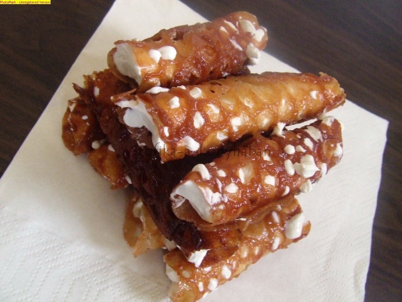 5. Egy fakanál nyelét bevizezzük és óvatosan rácsavarjuk a masszát. Tegyük rácsra, várjunk pár percig míg hűl,majd óvatosan húzzuk ki a fakanalat a cuccból.:)) Akkor jó, ha lyukacsos.