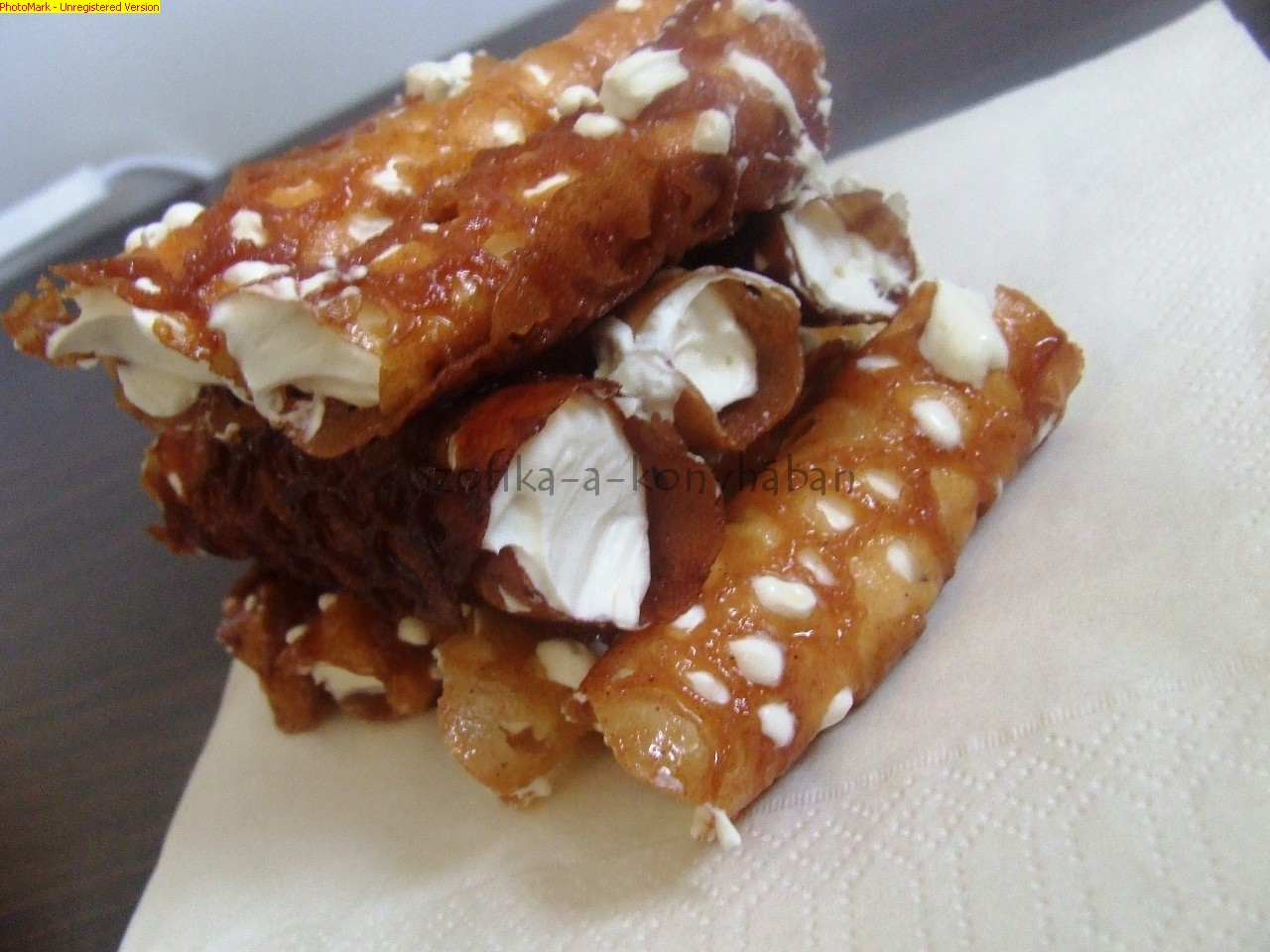 6. Süssük ki a maradék masszát ugyanígy, majd a brandy-vel felvert tejszínt nyomózsákból töltsük be a rudacskákba.