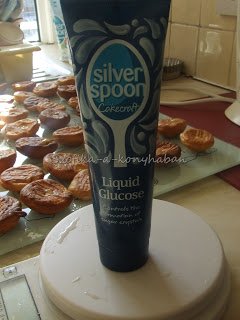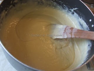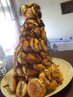 A karamellnek, amivel össze kell ragasztani a profiterolokat, kétszer álltam neki. Először fél kiló !! cukrot olvasztottam meg 1,5 deci vízzel és 1 ek. folyékony glükózzal ( ld. fenti kép), de az istennek se akart belőle karamell lenni. Ment a kukába. A következő kísérlet a jóöreg módszer volt: száraz serpenyőbe szórtam 4 ek. cukrot és megvártam míg karamell nem lett belőle:) Lényegesen egyszerűbb volt, de 4 alkalommal kellett ezt eljátszanom,mert annyira gyorsan megkötött a karamell, hogy nem bírtam olyan ütemben ragasztani a profiterolokat a gúlába.