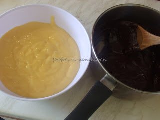 A tippek, hogy miért nem sikerült?? Mivel fele csoki ganache-sal, fele custarddal lett betöltve, nem lettek egyformák. A ganache megkötött a profiterolban, a custardos puha, folyós maradt.