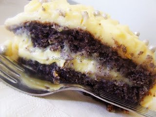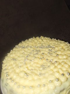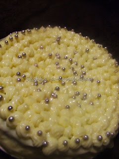 6. Amikor a torta kihűlt, félbe vagy háromba vágjuk és megtöltjük a krémmel, a tetejét és az oldalát is bevonjuk vele. Csokidarával vagy ezüst gyönggyel, esetleg mákkal díszítjük.