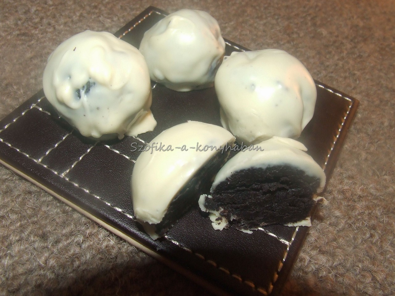 Flóránál ezt a trüffelt.Azonnal beleszerettem. Sose csináltam még fekete-fehér desszertet, és most a nővérkém tiszteletére megtörtént. Egyszerű, gyönyörű és isteni. A fotók elég borzasztóak, de most erre futotta. Biztosan nem most készítettem utoljára, úgyhogy majd frissítem.:)