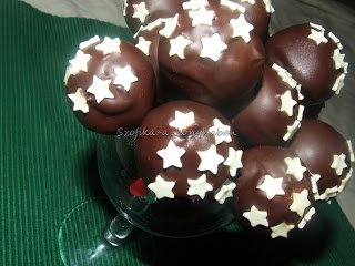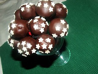 5. Kis golyókat formálunk a masszából. Először a pálcika felső részét mártjuk a csokiba ( azt a részt, ahol nincs alufólia, értelemszerűen), beleszúrjuk a golyót és megmerítjük a csokiban. A tetejét megszórjuk a fehércsoki csillagokkal ( vagy szemöldökcsipesszel tegyük rá) és a popot beleszúrjuk a hungarocellbe.
