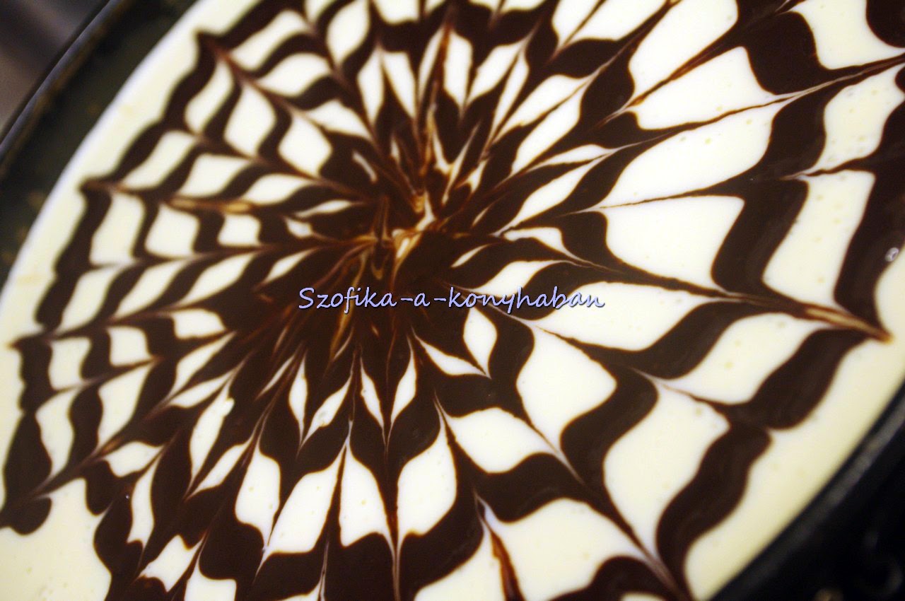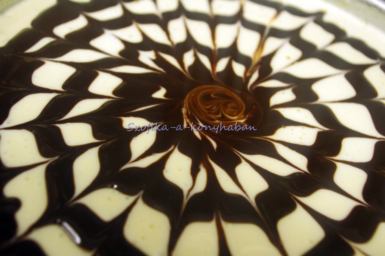 6. A díszítéshez a fehércsokit kevés tejszínnel felolvasztjuk és egy minihabverővel simára keverjük. Jó sűrű állagúnak kell lennie.Egy kancsóból a torta külsejétől a belseje felé haladva csigavonalban egy határozott mozdulattal ráöntjük a csokit.