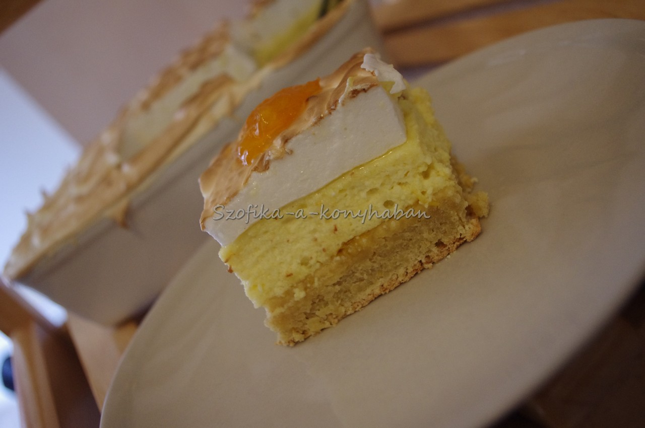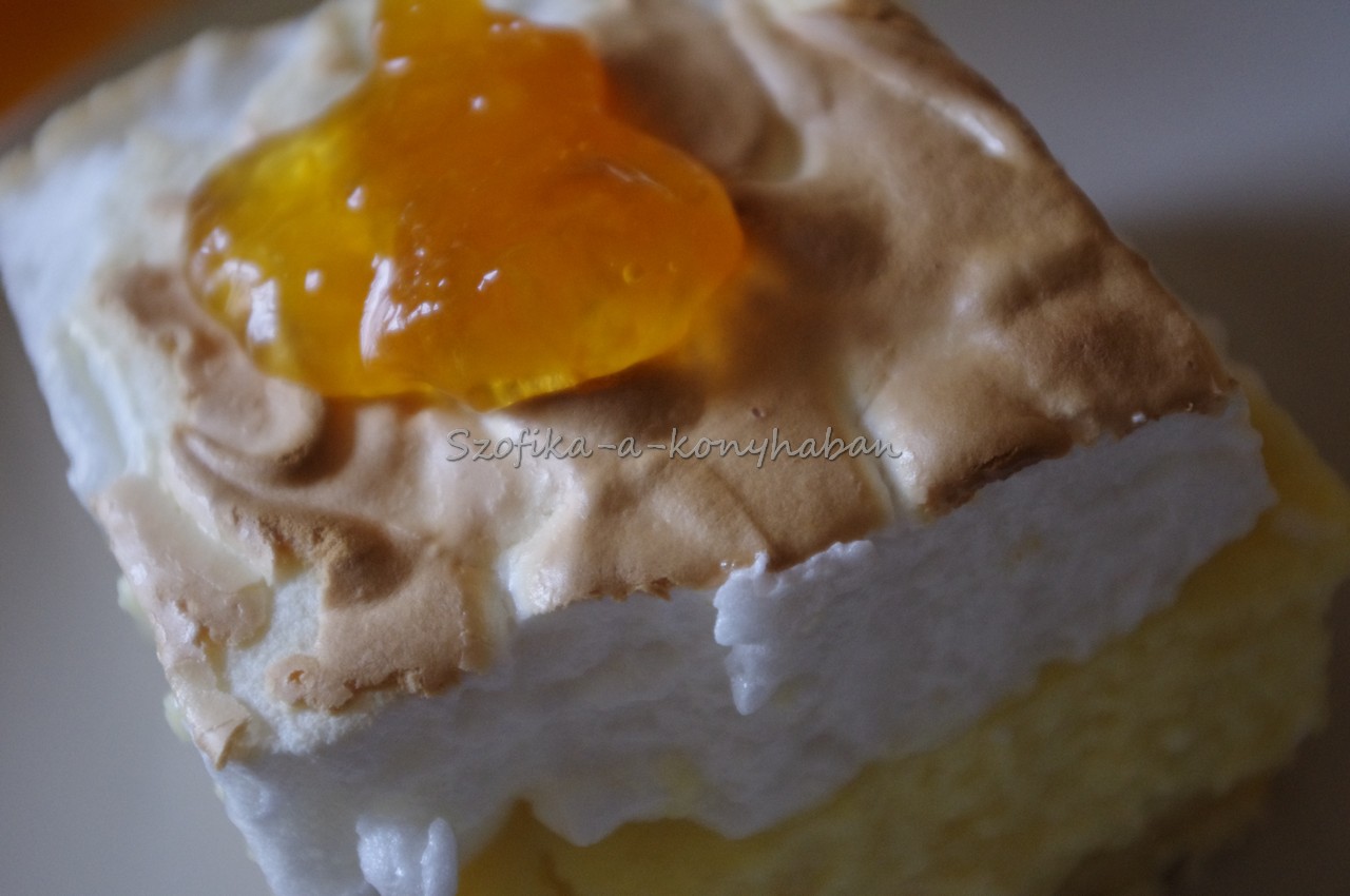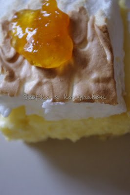 Ha rácsosra húztuk a habot a sütemény tetején, akkor töltsünk habzsákba baracklekvárt és a rácsok közeit ezzel töltsük ki. Ha nem rácsos a teteje, akkor meg csak kanalazzunk mellé ízlés szerint egy kis lekvárt.