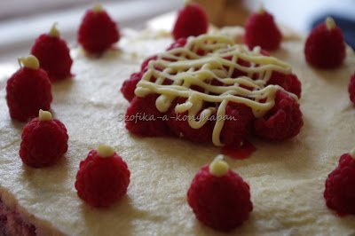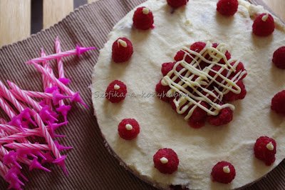 Ízre semmi gond nem volt vele, elvégre a málna-fehércsoki elég szigorú páros:) Legközelebb kihagyom szerintem a tejszínt meg a ricottát, sőt maradok a jól bevált Philadelphiás cheesecake-nél 🙂