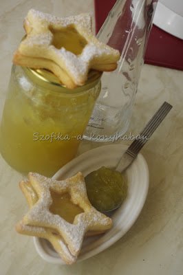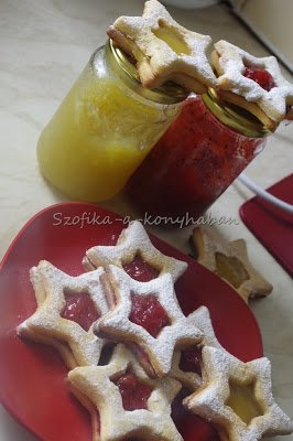 Sok minden debütált ezzel a mai linzerrel.Az elmúlt napokban készített, életem első két lekvárja, az Eper-kiwi és a Gyömbéres sárgadinnyelekvár. Valamint az az 5 db-os, csillag alakú szaggatókészlet, amire ma sikerült szert tennem. Azt gondoltam, a linzer hamar kész, pikk-pakk megvan.Hát nem így lett. Majd 2 órát szöszmötöltem vele, szaggatni nagy csillagot, kiscsillagot, töltögetni, porcukorral megszórni. Aztán újabb 1 órán át a lakás minden pontján próbáltam lefotózni,épp csak a fürdőszobában nem. Sem az erkélyen, sem a szobában, sem a konyhában nem sikerült. Pedig délután 2 óra volt, mondhatni, ideális fényviszonyok voltak-kellett volna, hogy legyenek. A 70 képből mindössze ez az egy lett használható, nekem ugyan ez sem tetszik, de valamit fel kellett tenni. Viszont a linzer isteni lett. A linzer-receptekben nem győzik hangsúlyozni, hogy lezárt fémdobozban akár 1 hétig!!!is eláll, na de kérem, hol nem esznek meg egy adag linzert egy hét alatt?Nálunk nem lesz fémdoboz, az biztos!!