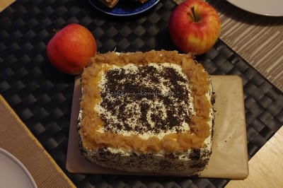 Alulra kerül az 1. lap. Erre kenjük a vaníliás krém kb. 1/4-ét. Erre jön a 2. lap. Erre kenjük az almás töltelék felét, majd a 3. mákos lap. Ismét a vaníliás krém 1/4-e, majd a 4. mákos lap. Erre jön az almatöltelék másik fele, majd az 5. mákos lap, 1/4 rész vaníliakrém , a 6. mákos lap és végül a torta tetejét és az oldalát is bevonjuk a vaníliakrémmel.