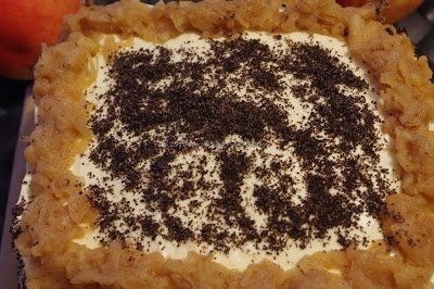 Nekem maradt egy kicsi az almás töltelékből, abból raktam ki a szélét, a közepét sűrűn, az oldalát pedig ritkábban megszórtam darált mákkal.