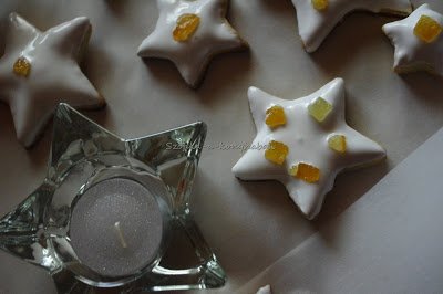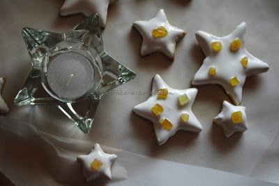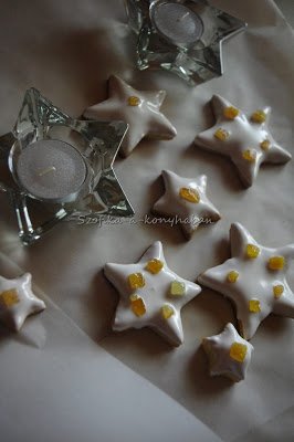 5. A kihűlt csillagokat mártsuk a mázba, díszítsük kandírozott narancshéjjal és szárítsuk meg.(kb. 1 nap)Ezután tegyük jól záródó fém-vagy műanyag dobozba.