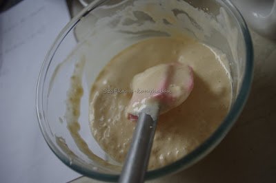 A két tojáshabot összeforgatjuk, hozzáadjuk az olvasztott vajat és a lisztet és lazán elkeverjük.
