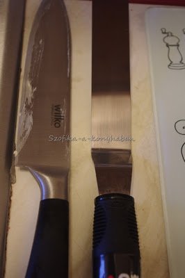 Szükségünk 1esz 1 doboslapra ( a legszebbre), 15 dkg cukorból készített doboscukorra ( karamellre), egy késre ( baloldalt) melynek élét és fokát is vajazzuk be és egy másikra( jobboldalt), amivel a karamellt elkenjük a tésztán.