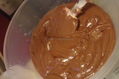 Ezután a kihabosított vajhoz adjuk hozzá a tojásos-porcukros masszát és a csokis masszát, dolgozzuk egyneművé kézi habverővel vagy szilikonlapáttal.