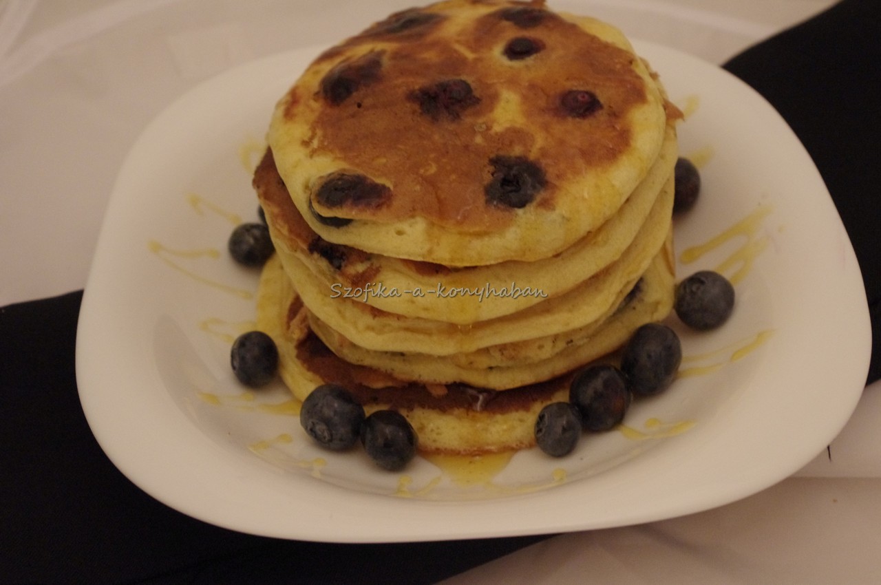 amerikai stílusú áfonyás verzióra esett ( Jamie Olivertől) aminek a tésztája teljesen más, mint a megszokott palacsintáé. Sokkal inkább mint egy piskótakorong. Juharsziruppal, mézzel, tejszínhabbal, esetleg tejföllel/ creme fraiche-sel/mascarponéval isteni!