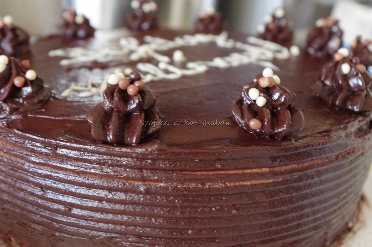 A másik, szintén az ő receptje alapján készített alkotóelem, a párizsi krém. Véletlenül sem nevezném a világ legfinomabb csokikrémjének, egy olcsó, könnyen és viszonylag gyorsan elkészíthető kakaós cukrászati alapkrém, amit aztán tovább lehet variálni mogyoróval, kávéval, likőrökkel. Rendkívül jó tartása van a krémnek,és noha csokoládé 1 gramm sincs benne, szép színe is, nagyon szépen lehet vele dolgozni, már ami a torta töltését-bevonását illeti.