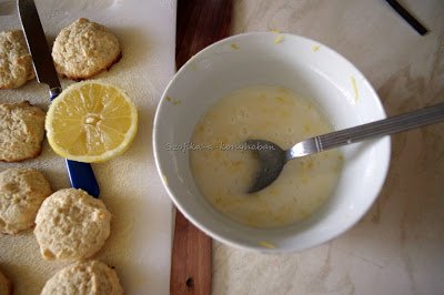 8. A kihűlt kekszek tetejére kb 1 teáskanálnyit tegyünk a mázból és a teáskanál hátuljával egyengessük el.Viszonylag hamar megköt teljesen a citrommáz és már falatozhatjuk is őket, reggelire kávéval, teával isteni!!!!