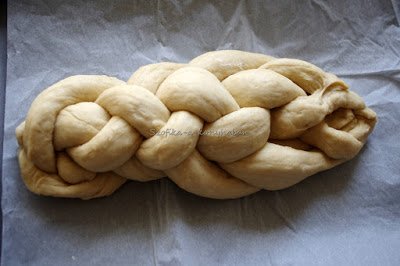 5. Divide the dough into 4 – 6 equal parts and roll out each part making 4 – 6 stripes and following the instructions of this video braid the bread. It is better to put the 4 – 6 stripes onto a grease-proof paper so when the bread is braided you just need to transfer it onto a tin.