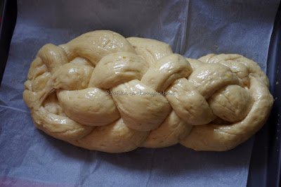 9. Verjünk fel 1 egész tojást és kenjük le a kalácsot. 20 percig pihentessük gőzös helyen ( én betettem kb. 40 fokos sütőbe, de azért figyeljünk rá), míg a tojás meg nem szárad rajta.