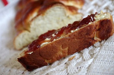 Folyamatosan figyeljük a kalácsot, elég hamar elkezd pirulni a teteje. Én 10 perc után meg is fordítottam, mert a belső fele szép piros volt, a külseje viszont még nem. 22 perc után beleszúrtam egy hústűt, a tészta nem bizonyult nyersnek, így el is zártam a sütőt és néhány perc után fel is vágtam a kalácskát. Vajjal, mézzel, lekvárral, vagy csak úgy magában, reggelire, uzsonnára, nasinak, bárhogy jöhet. Nálam indul a kalácsszerelem.:)