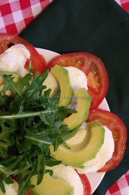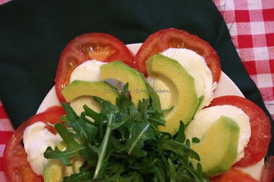 3. A tányéron kívülről befelé haladva helyezzük el a paradicsomot, a mozzarellát és az avokádót. Középre halmozzunk ruccola salátát.