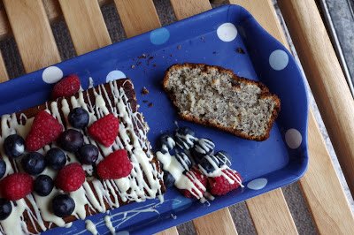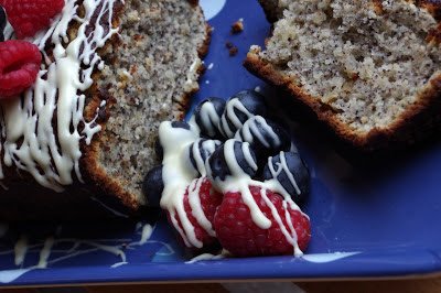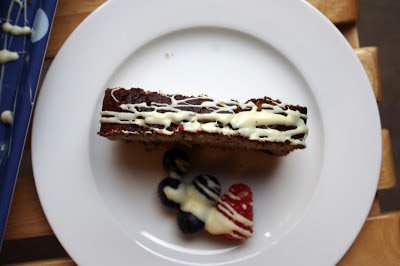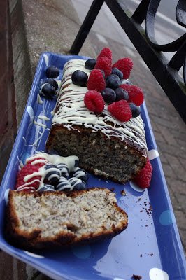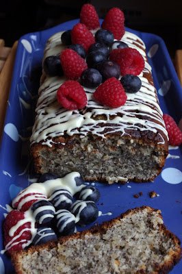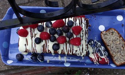 6. For the glaze, melt the white chocolate in microwave and pour over the cake.Serve with fresh blueberries and raspberries or any other seasonal berry fruits.