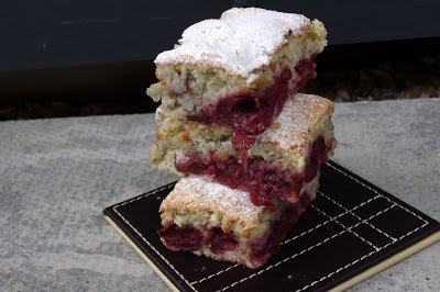 5. A meggyet is a piskótatésztába forgatjuk, belesimítjuk a masszát a tepsibe és kb. félóra alatt készre sütjük.