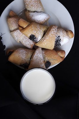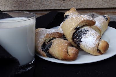 4. A cipót kör alakúra nyújtjuk, megkenjük a töltelék felével és pizzavágóval vagy éles késsel 8 cikkre vágjuk. A cikkeket feltekerjük, sütőpapíros tepsire tesszük őket és betoljuk a HIDEG sütőbe.