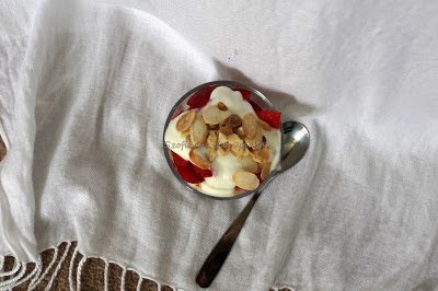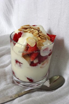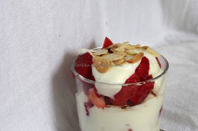 4. Rétegezzük a pohárba őket: eper-joghurt-mandula, eper-joghurt-mandula.