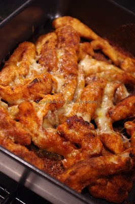 1. A csirkét megmossuk, az inakat kivágjuk, a hártyákat levágjuk. Sózzuk, borsozzuk, majd pirospaprikával elkevert lisztben megforgatjuk őket.