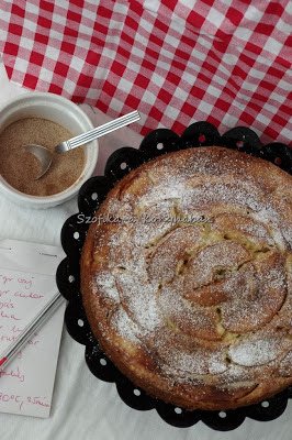 2. Kivajazott-kilisztezett kapcsos tortaformába öntjük a masszát, a tetejét kirakjuk vékonyra szelt almaszeletekkel. Fahéjas cukorral bőven megszórjuk.