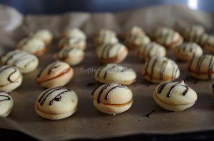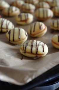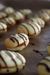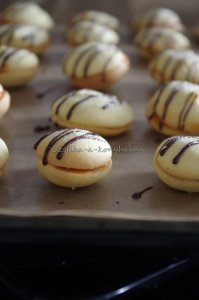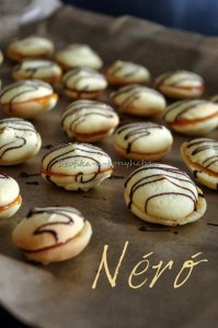 4. A kihűlt nérókat baracklekvárral összeragasztjuk, sütőpapíros tepsire ültetjük őket és olvasztott csokival áthúzzuk a tetejüket. Én most még ehhez is temperáltam a csokit, hogy szebb legyen.:)