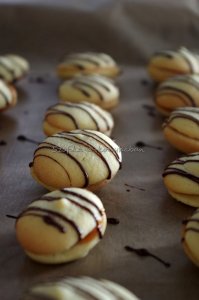2. Habzsákba töltjük a masszát és sütőpapíros tepsire kis gömböket nyomunk. Hagyjunk helyet köztük, kissé terülni fognak.