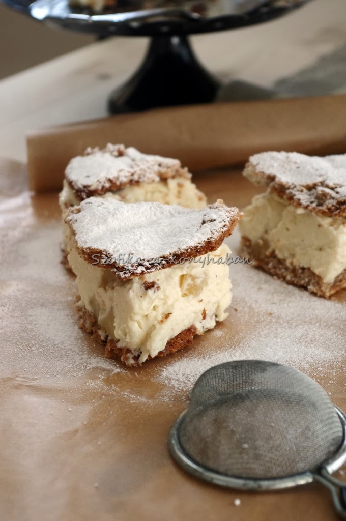 Ha kicsit egyszerűbbre, gyorsabbra szeretnénk, akkor a mogyorós lapok helyett sima piskótával vagy fehér piskótával is készíthetjük. Porcukorral szórjuk meg tálalás előtt, érdemes.:)