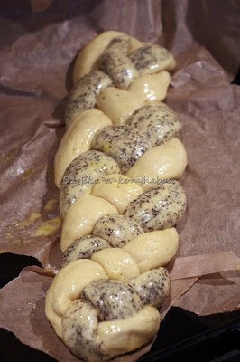 4. A rudakat sütőpapírral bélelt gáztepsire helyezzük úgy, hogy 1 sima, 1 mákos, 1 sima, 1 mákos, a tetején összecsípjük őket. Ezen videó segítségével összefonjuk a kalácsot. Nekem ez sokkal egyszerűbb és sokkal szebb,mint a 6 ágú.