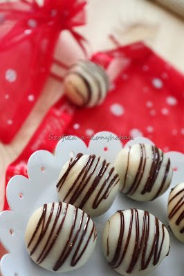 4. Melt the chocolate in microwave, put in a little plastic bag, cut out the corner of the bag and decorate the balls. Put them back in the fridge for another 1-2 hours or until the chocolate sets on top.