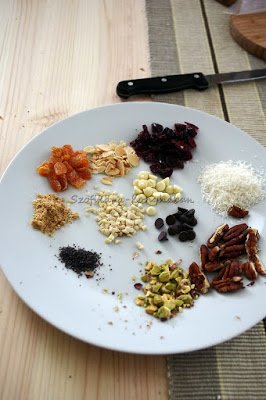 fehércsokicsepp, étcsokicsepp, darált mák, darált dió, kókuszreszelék, aprított pisztácia, aprított mogyi, szeletelt mandula, aszalt sárgabarack, aszalt vörösáfonya, pici marcipán reszelve, pekándió