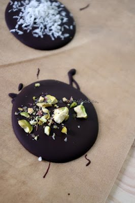 4. Ekkor öntsünk ki a sütőpapírra 8 kis adagot és egy kiskanál hátuljával egyengessük kör alakúra az olvadt csokit. Szórjuk meg tetszés szerint a feltétekkel.