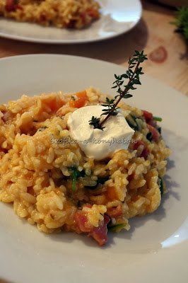 6. Tálaláskor 1 evőkanálnyi mascarpone krémsajtot tegyünk a rizottó tetejére-ettől még lágyabb, még krémesebb lesz a rizottó. Tűzzünk 1 szál kakukkfüvet a krémsajtba és kész is. Hát nem ünnepi?