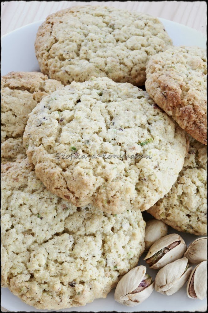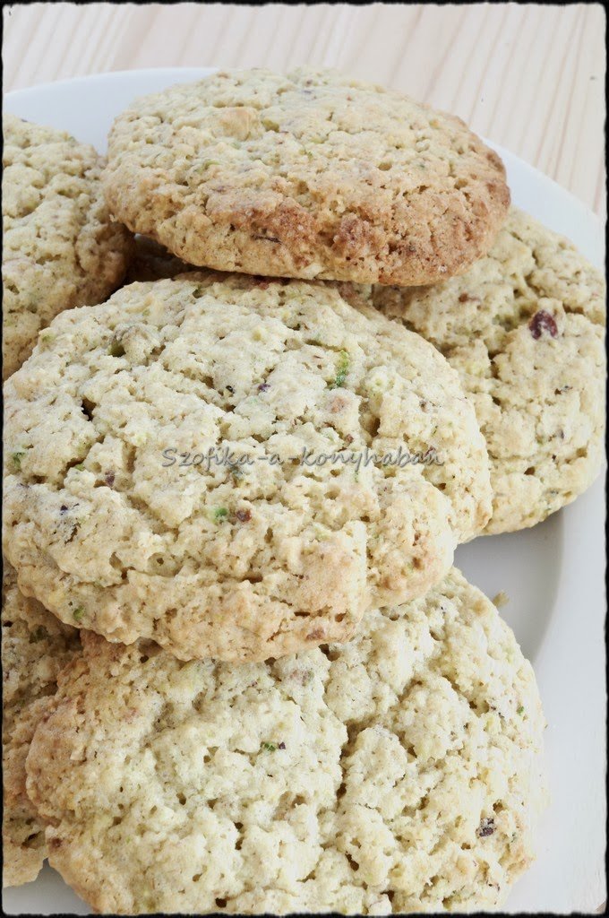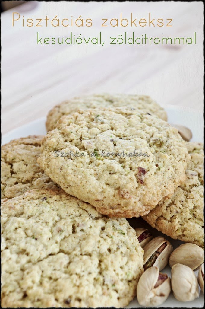 Ismét egy változat zabkekszre, a mandarinos itthon aratott sikerén felbuzdulva. Pisztáciával, kesudióval és némi lime-mal, így kissé zöldes beütést kapott, jól passzol a reggeli smoothie-hoz.:)