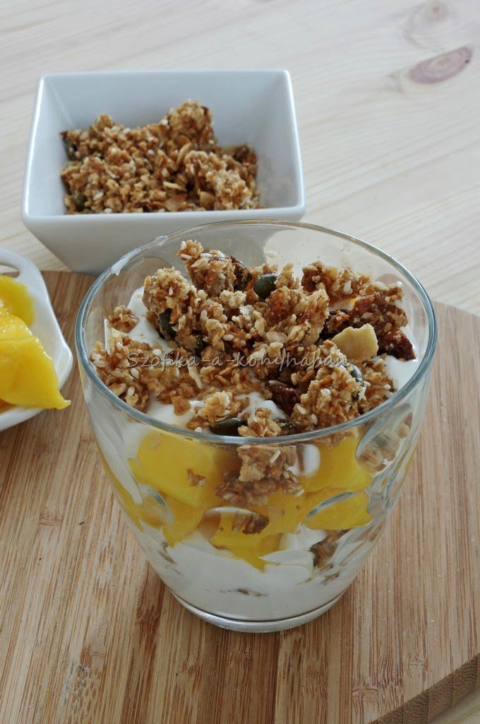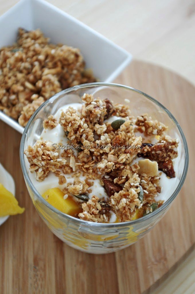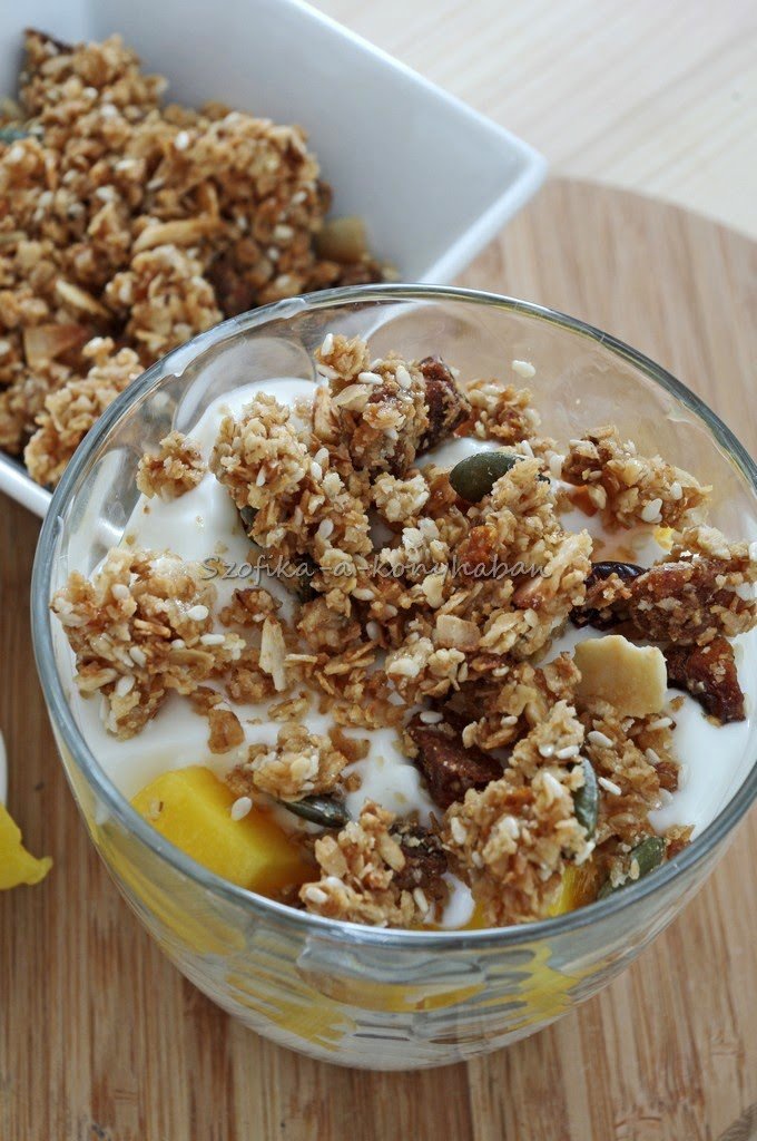 A granola egy olyan keverék, amely zabpehelyből,olajos magvakból, aszalt gyümölcsökből áll, mézzel/ cukorral keverik össze, megsütik, majd kihűtve fogyasztják akár tejjel, akár joghurttal, friss gyümölcsökkel megturbózva reggelire, de akár süteményekbe is használhatjuk. A boltok polcain találkozhatunk különféle ízesítésű granolákkal, aranyáron mérik őket és a jóég tudja,mennyi cukrot tartalmaznak. Tehát olcsóbb is és egészségesebb is, ha otthon állítjuk elő, így legalább tudjuk mi kerül bele és csupa olyan dolgot tehetünk bele, amit szeretünk. Biztos mindenkinek van legalább 1 olyan aszalvány vagy mag, amit nem szeret és kipiszkál ezekből a keverékekből:) Dobozba téve sokáig eláll és tényleg csak a fantáziánk szab határt a granola-készítésnek: használhatunk fűszereket, fagyasztva szárított gyümölcsöket is adaléknak.